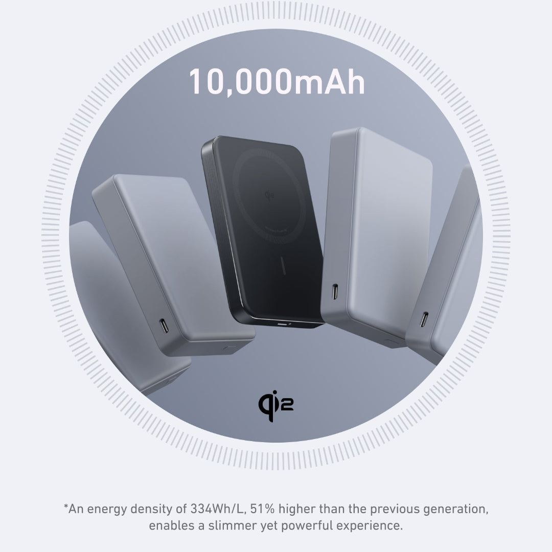 A slim magnetic power bank with a 10,000 mAh battery for everyday wireless charging.